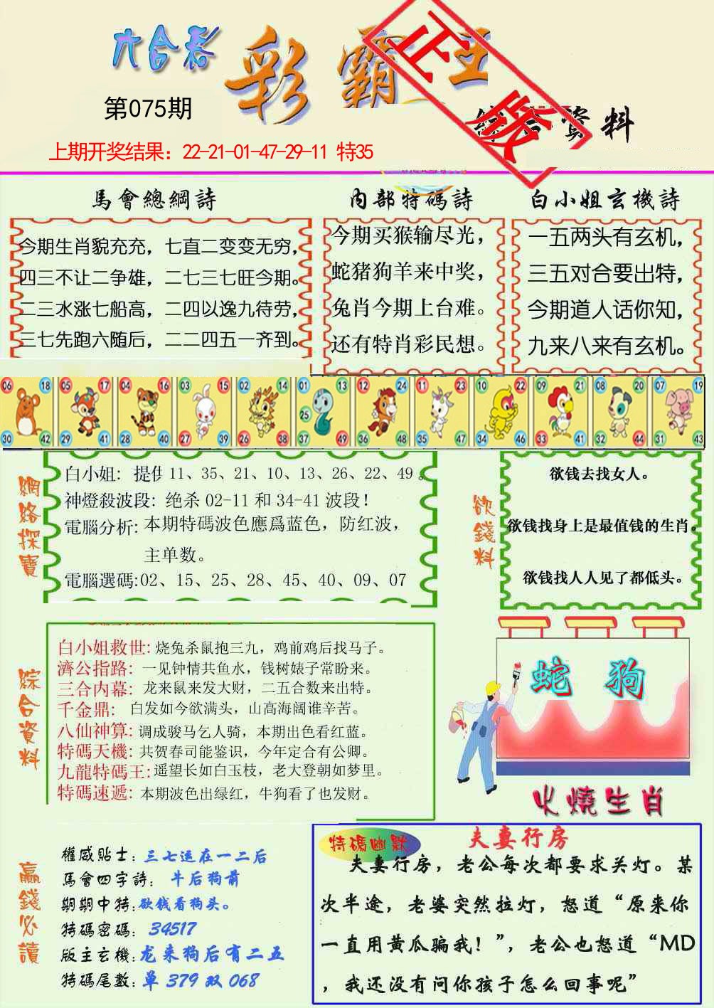 | 075期②肖 | 鼠狗 | 开:?00 |